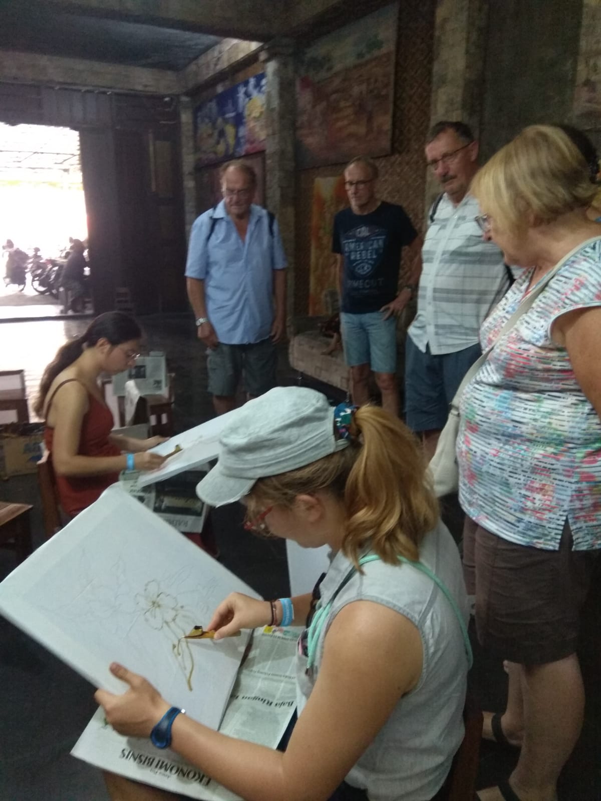 This vacation guest from the Netherlands traveled from Jakarta, Bandung, Yogyakarta, Mount Bromo, Ijen Crater, and Bali. One of the programs carried out when visiting the city of Yogyakarta is learning to make batik at the Kabul Art Gallery. Everyone will be given batik media so that the results of the batik crafts that have been made can be taken home and used as souvenirs.